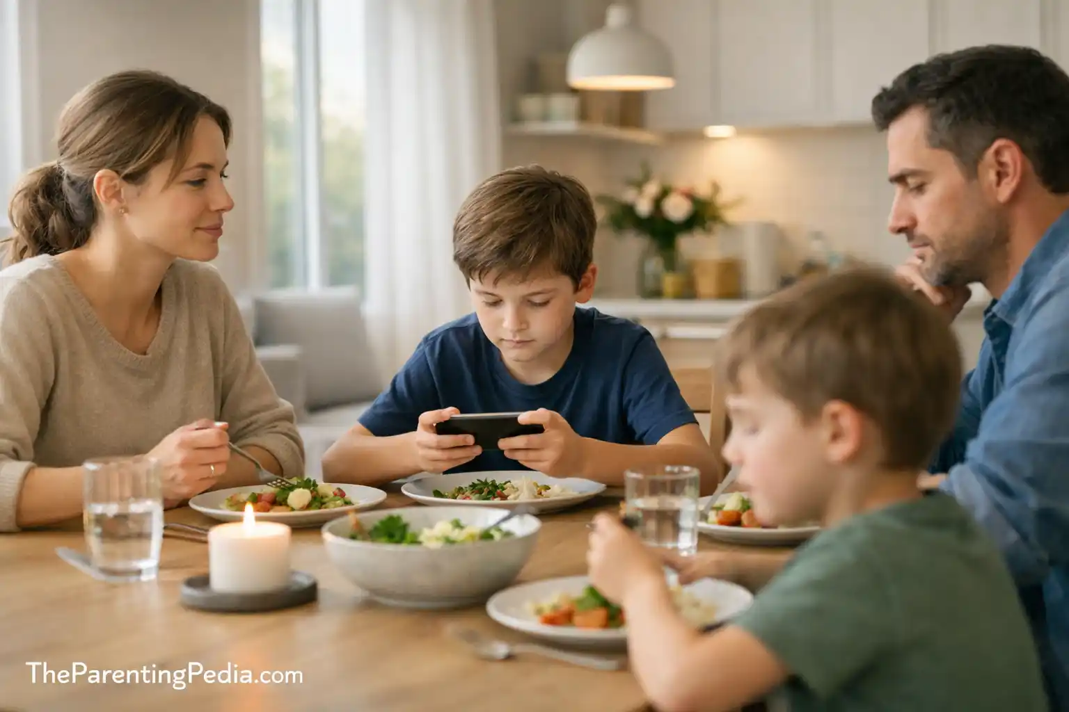 Family using mobile phones at dinner showing early signs of gaming addiction in children
